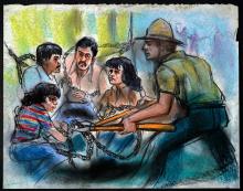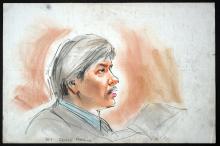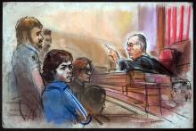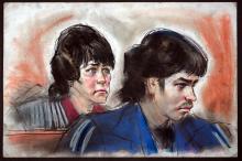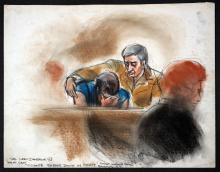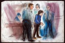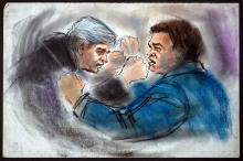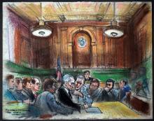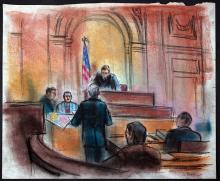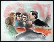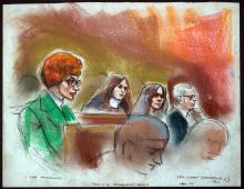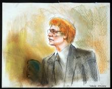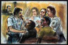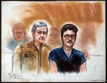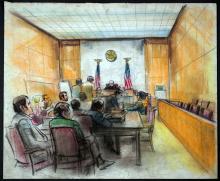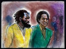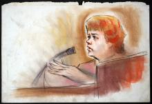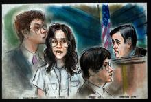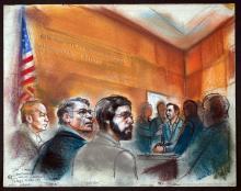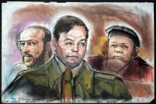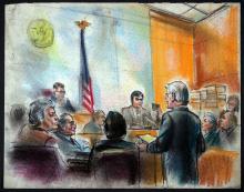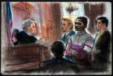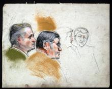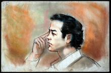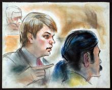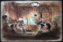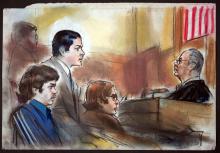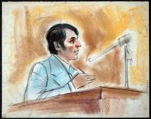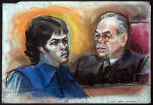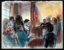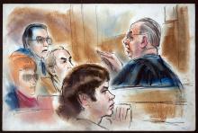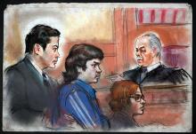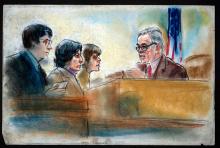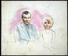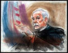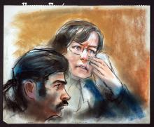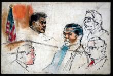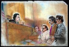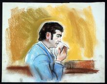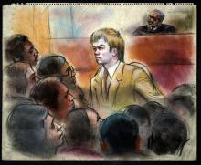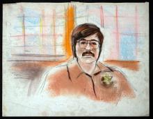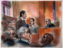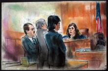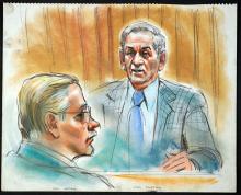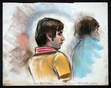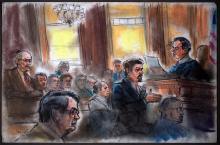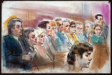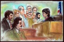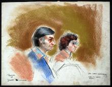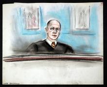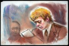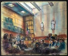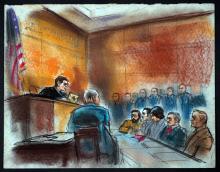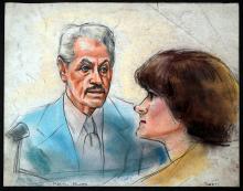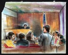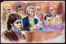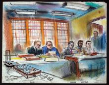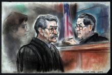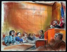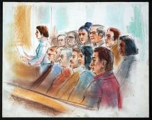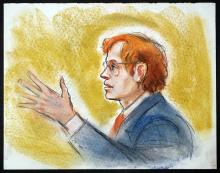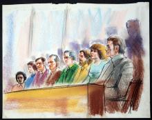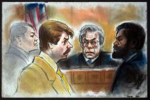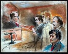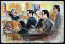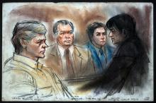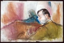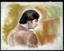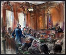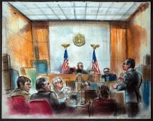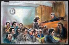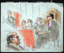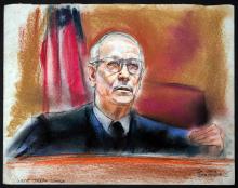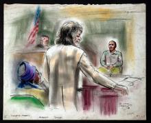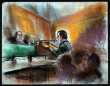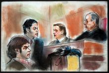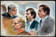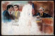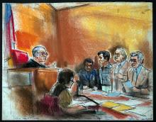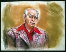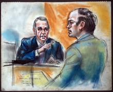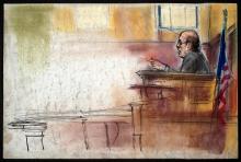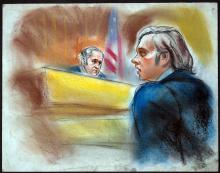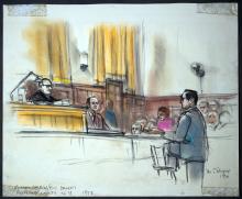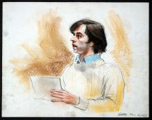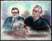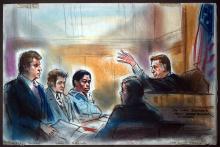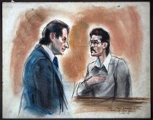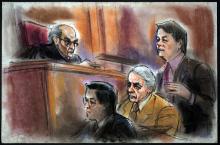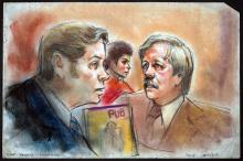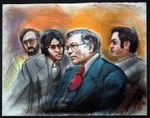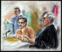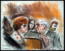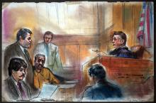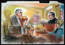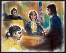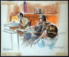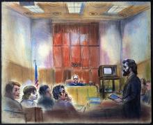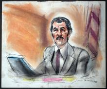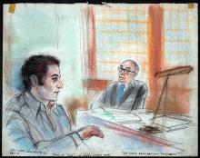 Author Norman Mailer observes as defense attorney Ivan S. Fisher questions Jack Henry Abbott. Prosecutor James H. Fogel and Acting Justice Irving Lang also appear in sketch. |