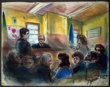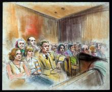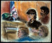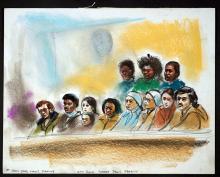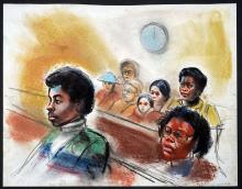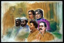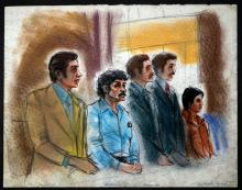 Arraignment of Brink's Robbery defendants Kathy Boudin, Judith Clark, Samuel Brown, and David Gilbert. |