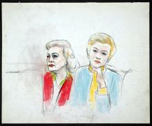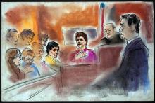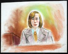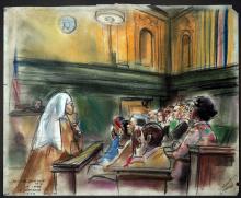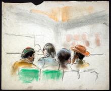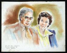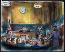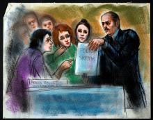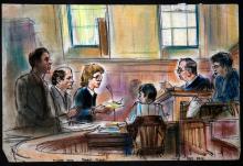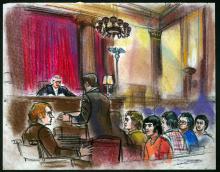 Betty S. Murphy, the first woman to serve on the National Labor Relations Board, appears in courtroom scene with David M. Silberman, Associate General Counsel to the AFL-CIO. Judge Melvin J. Welles also appears in sketch. |