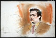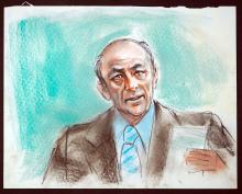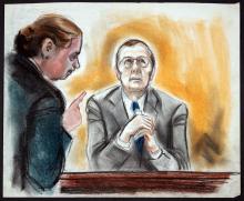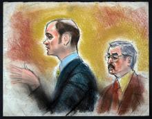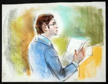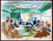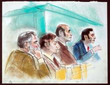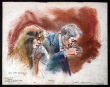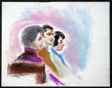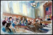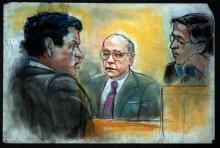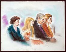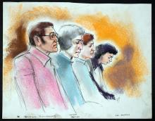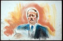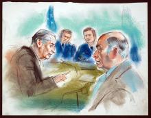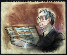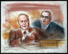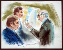 Harry L. Sears, a former associate of Robert Vesco, testifies during the Watergate-related trial of John Mitchell and Maurice Stans. Peter Fleming and John Sprizzo, defense attorneys to John Mitchell, also appear in sketch. |
