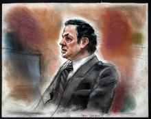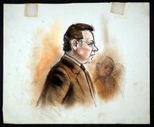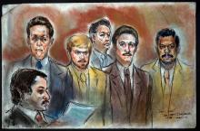 Melvin Weinberg testifies during Abscam trial of Rep. John Murphy, Judge Pratt, Thomas Puccio, Rep. Frank Thompson Jr., and Thompson's attorney, Stephen E. Kaufman also appear in sketch. |