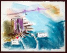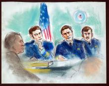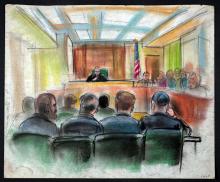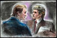 Richard A. Meany testifies during Coast Guard inquiry on the sinking of Joan La Rie III. Captain Ronald Pickup also appears in sketch. |