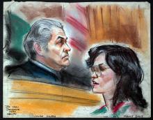 Defendants from the Bonanno crime family, from left to right: Benjamin Ruggiero, Nicolas Santora, Vincent Lopez, Antonio Tomasulo, and Anthony Rabito. Prosecutor Barbara S. Jones questions FBI infiltrator Joseph Pistone (AKA Donnie Brasco), while Judge Robert W. Sweet presides. |