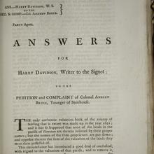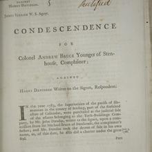 Charles Hay, of Newton, Lord Newton, "Duplies for Harry Davidson Writer to the Signet; To The Replies for Colonel Andrew Bruce, younger of Stenhouse," 7 Dec 1790 , Scottish Court of Session Digital Archive Project. Charlottesville: University of Virginia Law Library, 2015-2019.